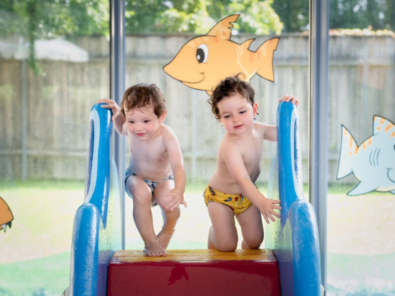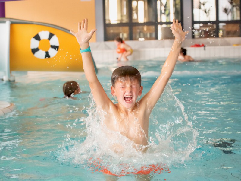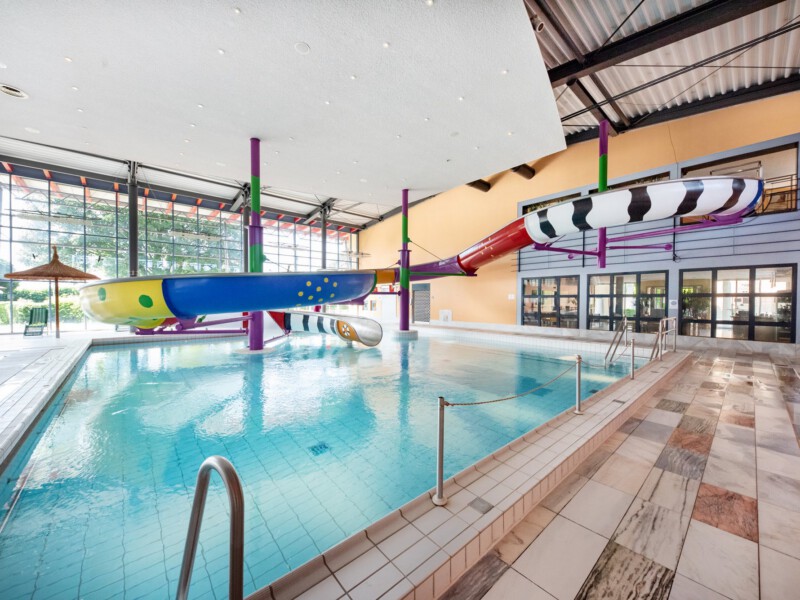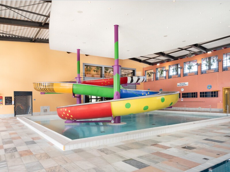 Nehmen Sie Schwung und rutschen Sie auf direktem Weg in das mit 32°C angenehm temperierte Lehrschwimmbecken.